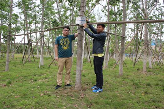 yl9193永利集团认捐的银杏树居于“校友林”第一排中间地带,长势喜人。活动中,A11养殖班李越超和Y12捕捞班李国成同学代表132名yl9193永利集团2015届毕业生将树牌郑重地挂在认捐的银杏树上。