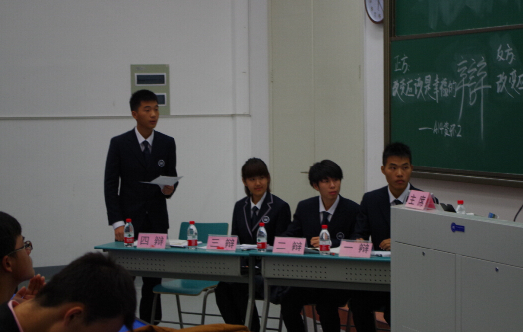在主席高涵婷介绍完比赛规则后,辩论赛正式拉开了帷幕。资环2班作为正方认为“改变是幸福的”,首先由正方一辩进行3分钟的开篇立论。一辩选手指出“改变”要从个人意愿出发,而在个人意志上为出发点的“改变”是积极进取的,其结果也是美好的。随后,由反方一辩进行破题立论,她从“改变”的开始、过程、结局等三方面出发,阐述了“改变”是结果带有不可预知性。根据对方一辩选手的陈词,双方四辩都进行了犀利的质询,在场观众开始感受到双方对辩的浓烈火药味。最精彩的比赛环节要属自由对辩阶段,反方四辩提出了“砂石变珍珠”的例子,强调砂石变为珍珠的过程是痛苦的,但正方二辩立刻进行了“反击”,他承认其中的过程是痛苦的,但是“变为珍珠”的结局是幸福的。此刻,在场观众都开始为正方二辩鼓掌,比赛的气氛也推进到高潮阶段。值得一提的是,正方四辩选手在进行最后的陈词小结中,动情的表达了自己在这次辩论赛中的成长和收获,巧妙地结合辩题“改变是幸福的”,从情感角度阐明自己参加比赛做出的改变是幸福的。