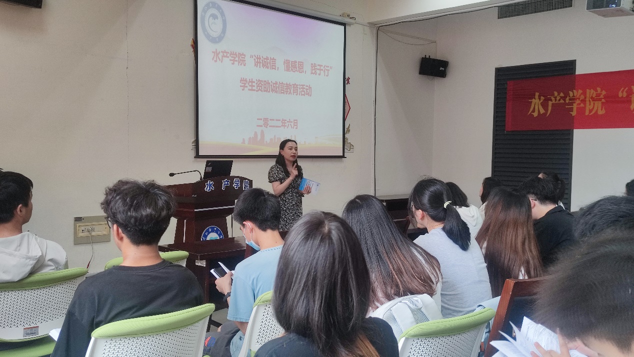 林老师从“诚”、“信”这两个汉字的形成渊源,进一步解释诚信的意义和重要性,同时向在场学生展示了获得奖助学金优秀学生的先进事迹,既展示了我院资助政策的合理性,也帮助大家更好地树立了诚信理念和良好形象,营造了良好的资助氛围。