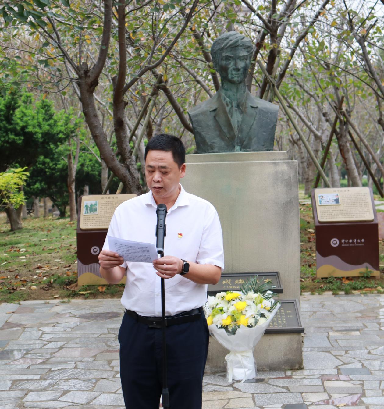 yl9193永利集团党委书记薛利建同志致追思辞,深情回顾王成海烈士生平,号召师生学习其英勇无畏的精神,传承红色基因,激发爱国热情。薛利建表示:王成海烈士以短暂的生命轨迹向祖国、人民交上了一份满意的答卷,“成海精神”已经深深融入海大的文化血脉中,为我们提供了丰富的精神寄托和文化滋养。激励我们不忘初心、牢记使命、勇担责任、追求卓越。