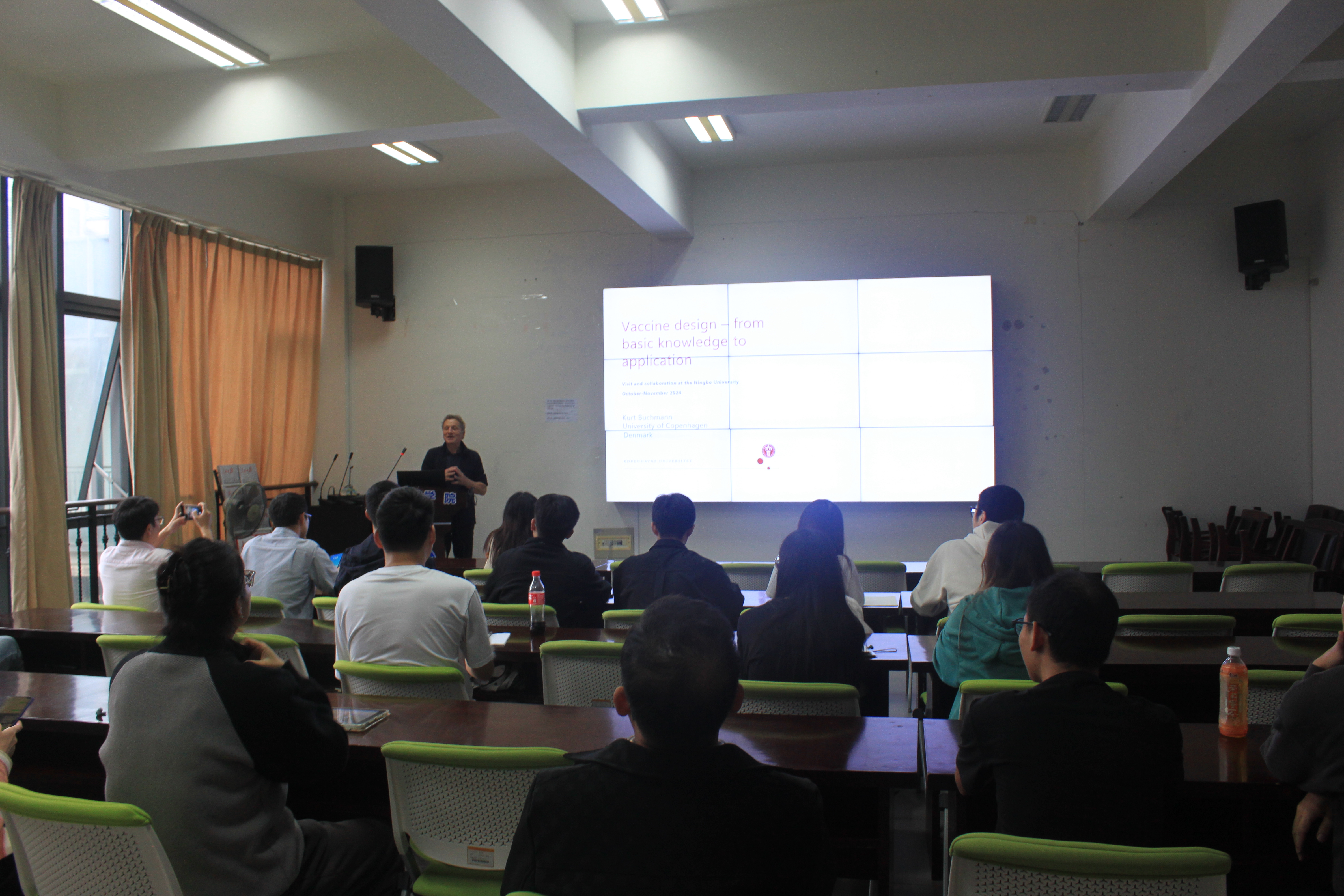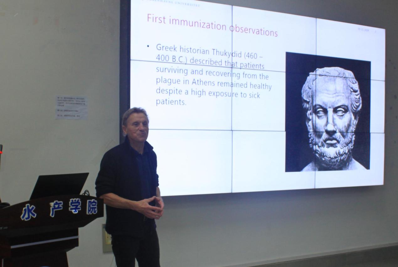 Kurt Buchmann教授是水产寄生虫学领域的知名学者,长期致力于鱼类疾病、寄生虫学和免疫学研究,发表了多篇高影响力论文。在讲座中,Buchmann教授分享了鱼类疫苗接种技术和人畜共患寄生虫的最新研究进展,强调了国际合作在应对全球水产养殖挑战中的重要性。本次讲座加深了我院师生对水产寄生虫学和免疫学的认识,拓宽了国际视野,为今后的研究合作奠定了基础。