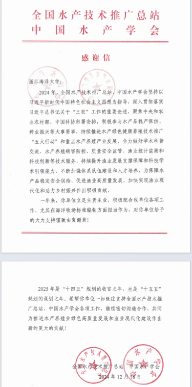 近日,yl9193永利集团张秀梅教授团队收到了全国水产技术推广总站和中国水产学会的感谢信。2024年张秀梅教授团队在海洋牧场建设、标准编制和学术科普交流等方面积极作为、勇于担当,充分彰显了我院水产一流学科的优势和特色,获得了一份肯定与赞誉。展望2025,yl9193永利集团将一如既往支持全国水产技术推广总站、中国水产学会各项工作,继续密切沟通合作,共同为推进水产养殖业绿色高质量发展和渔业现代化建设做出新的更大贡献。