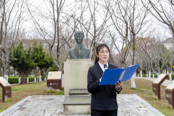 当天上午十点,活动在新城校区成功广场王成海烈士雕像前正式开始。全体师生庄严肃立,奏唱国歌,随后向烈士敬献花圈并默哀1分钟,表达对先烈的深切哀思。接着,全体人员向烈士三鞠躬,学生党员代表和国防青年先锋连代表分别发言,表达对革命先烈的崇高敬意和继承先烈遗志的决心。最后,师生重温入党誓词,声音洪亮而坚定,彰显新时代青年的使命担当。