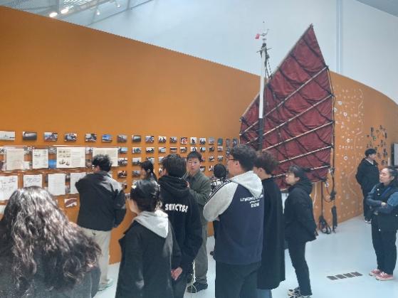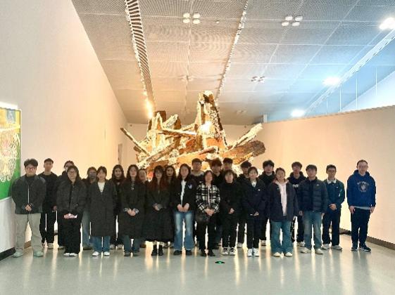 祭扫结束后,一行前往舟山美术馆参观“共栖之舟”。展览以独特的视角将舟山的历史底蕴与现代艺术巧妙交融,带领观众穿越时光长河,从硝烟弥漫的往昔岁月到蓬勃发展的蓝色经济时代,全方位展现舟山深厚而独特的海洋文化基因。师生们在展厅中驻足凝视,沉浸于一幅幅艺术作品所构建的时空对话中,感受历史厚重感与艺术创造力交织的震撼,体悟舟山海洋文明在时代浪潮中的传承与新生。