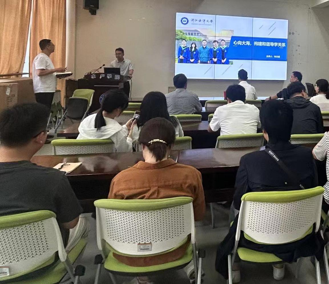 朱文斌教授以“心向大海,构建和谐导学关系”为题,结合自身带学生的经验,从“导学关系的现状与挑战、和谐导学关系的核心理念、实践策略、导师的自我修养”四个方面与大家进行了分享与探讨。