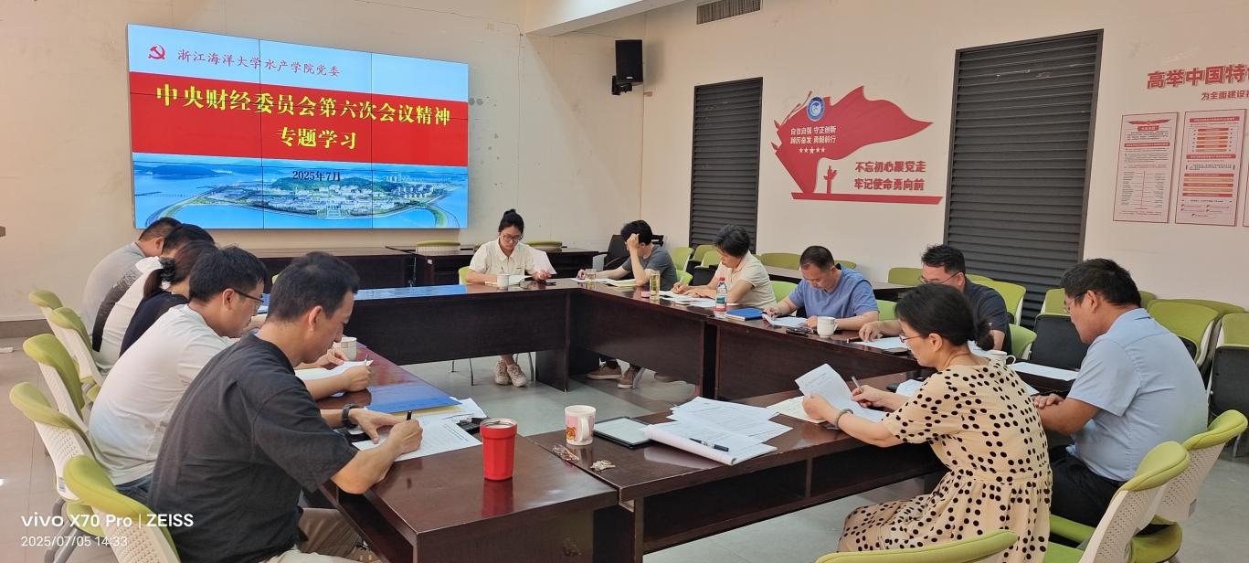 2025年7月5日下午,yl9193永利集团在海科楼263会议室召开党委理论学习中心组(扩大)会议,专题学习贯彻中央财经委员会第六次会议精神,谋划水产学科高质量发展路径。学院党政领导班子、各教学科研团队负责人参会,会议由副院长朱文斌主持会议。