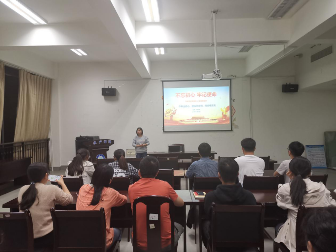以身边榜样的故事逐渐引入主题,她用亲切的语言将“不忘初心、牢记使命”与研究生不同专业方向联系起来,从什么是初心,中国共产党人的初心和使命是什么,开展主题教育,立足专业、深入行业、永久奋斗四个方面展开讲解。中国共产党的初心和使命是中国共产党的性质宗旨、理想信念、奋斗目标的集中体现。中国共产党的初心和使命,是党的先进性和纯洁性的集中体现,是激励一代代中国共产党人前赴后继、英勇奋斗的根本动力。她要求每位党员,不要忘记自己的入党誓词,每位团员不要忘记自己的入团誓词,坚定自己的政治信仰,站好自己的政治立场;将个人的理想融入到党的伟大梦想之中,勤奋学习,努力掌握过硬的专业本领,培养过人的专业素养,永葆奋斗精神,永怀赤子之心。“不忘初心、牢记使命”主题教育为我们每个人都提供了一次净化思想、提升素养、检验作为的一次良好机会,她希望每个研究生党员、研究生团员都积极主动地参加主题教育,做一名合格党员和团员。