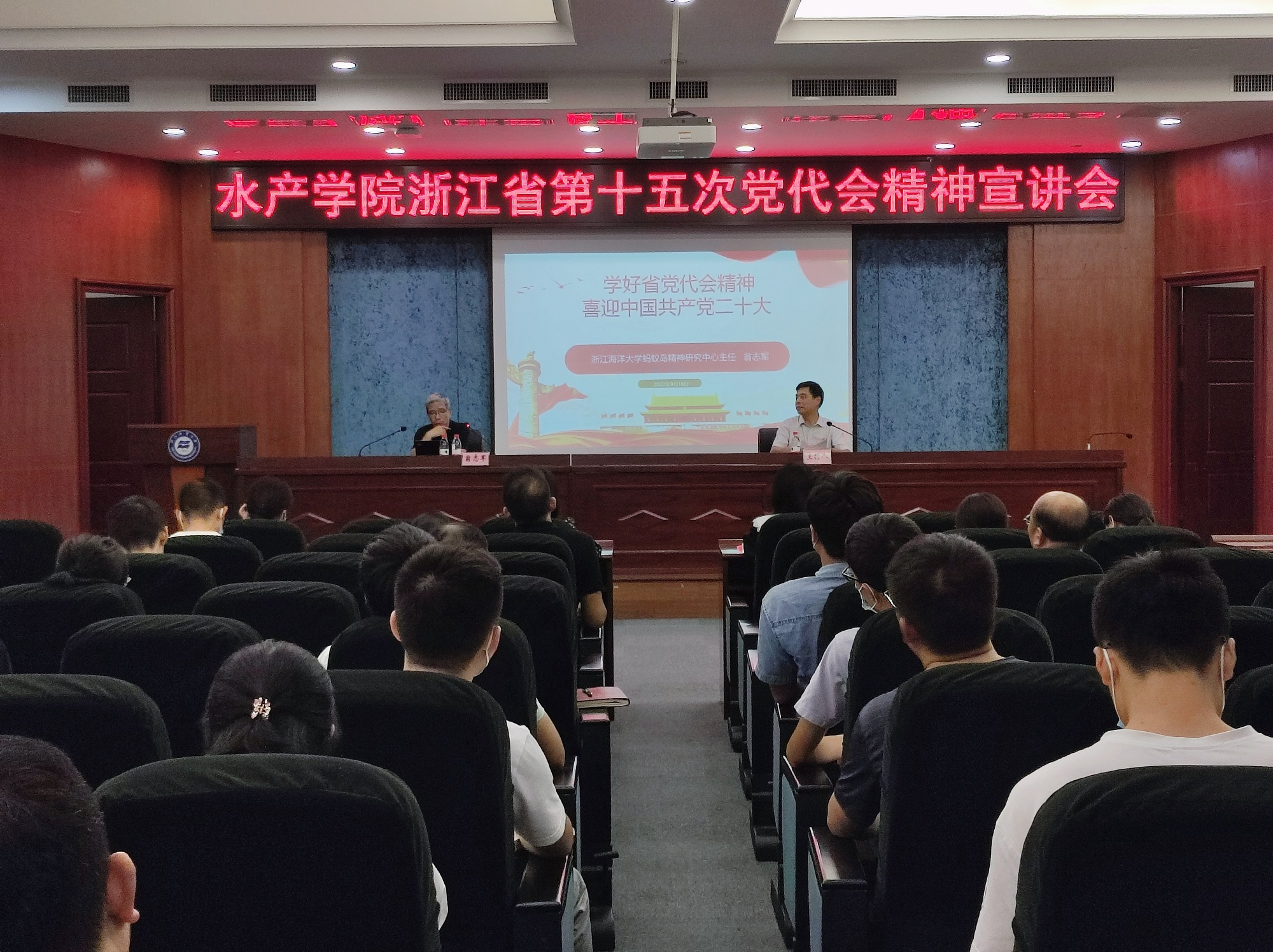 虞浩臣在主持宣讲会中指出,翁志军主任的报告主题突出、资料翔实,既有深入浅出的理论阐述,又有旁征博引的精彩分析,对我们进一步学习掌握省第十五次党代会精神实质,践行“八八战略”,投身“两个先行”具有很强的理论指导作用。虞浩臣要求全院师生党员及全院教职员工把思想和行动统一到省党代会精神上来,自觉做“红色根脉”的坚定守护者、“八八战略”的忠实践行者、“重要窗口”的优秀建设者、共同富裕和现代化的先行探路者、干在实处走在前列勇立潮头的不懈奋斗者,以饱满的工作热情和扎实的工作作风,以更加奋发有为的精神面貌投入到为建设“特色鲜明、国内一流”的高水平海洋大学的事业中去,以优异成绩迎接党的二十大胜利召开。