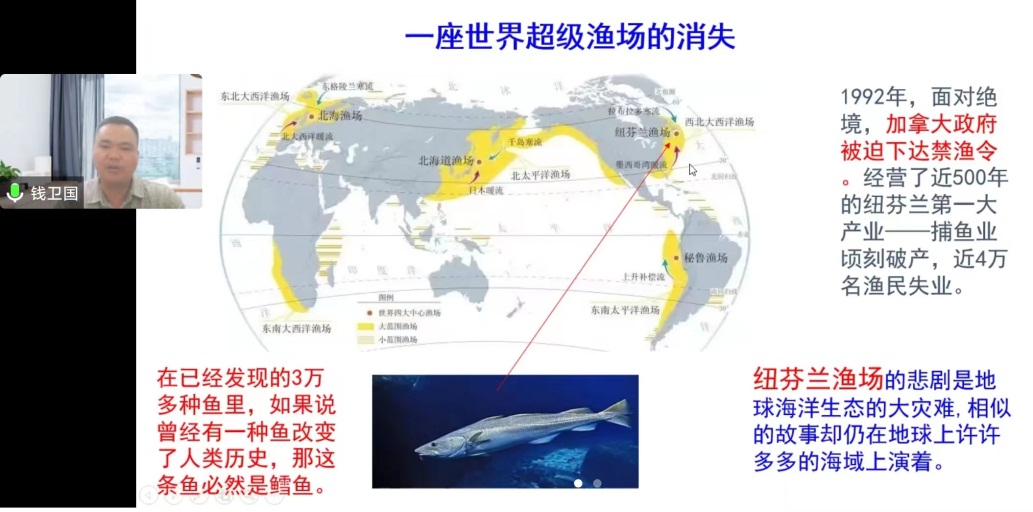 钱教授以“纽芬兰渔场鳕鱼的兴衰历史”、“世界级难题——大黄鱼资源重建”、“大洋能量物质循环及其气候效应”、“极地快速变化机制”等海洋科学领域命题和探索为结尾,给青年学生留下对海洋强国梦的思索。