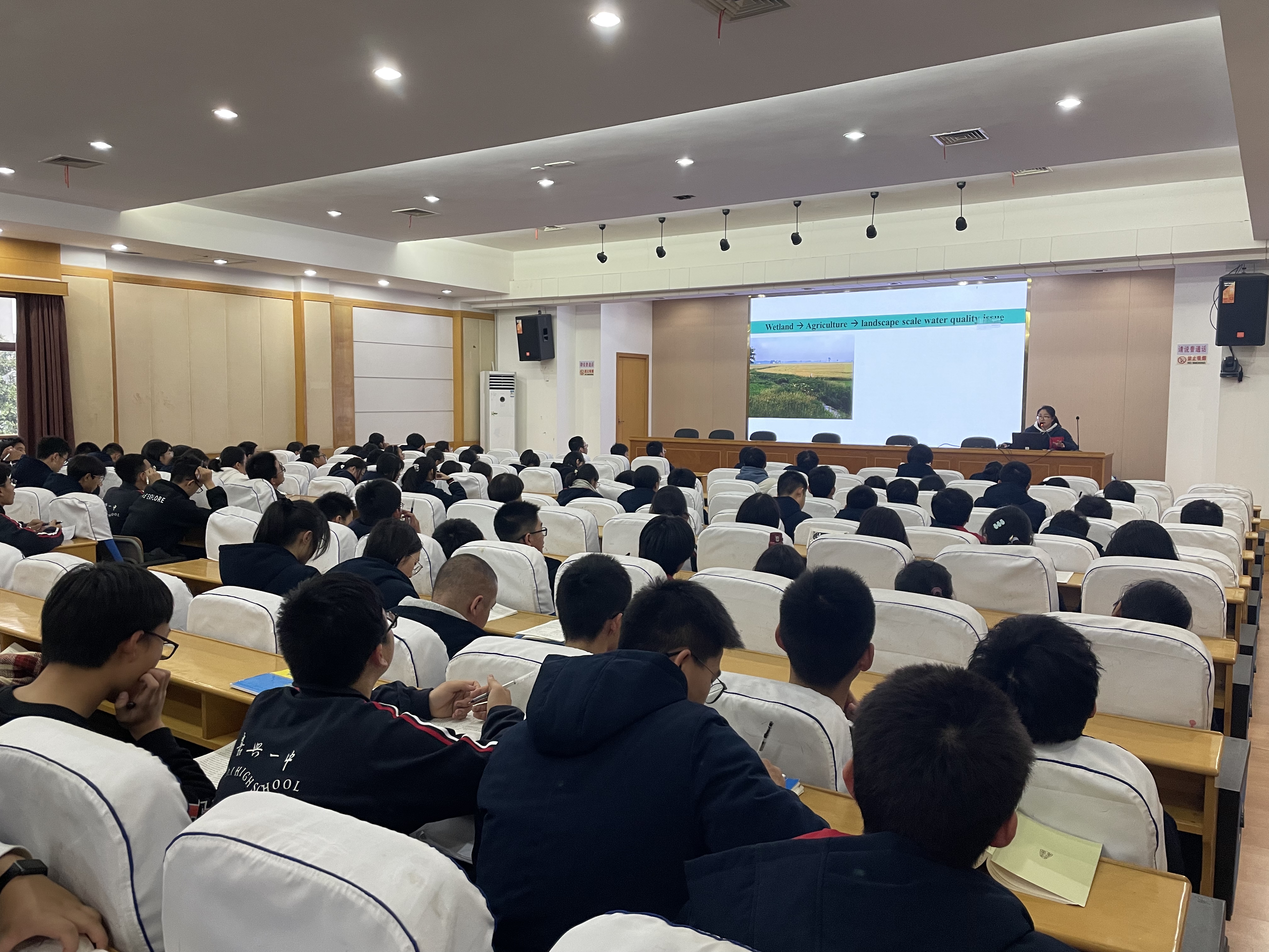 讲座以英文演示文稿为基石,形象化图片作辅助。从“碳氮磷元素循环”解剖当前湿地退化内外机理,从生命层面以及非生命层面角度搭建氮循环新视野。姜冰冰老师在讲座进行中设定6个有奖问答,让学生熟悉水循环、氮循环各环节顺序机制,以及专业英语词汇表达,推动讲座走向沸腾。