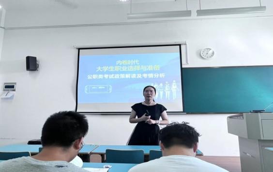 随后,由赵老师将话题转到“如何就业”。以“为什么考公,怎样考公”开展公职类考试政策解读及考情分析。期间,赵老师详细介绍选调及专业公务员招录选拔情况,并对相关岗位的招录范围及条件进行分析,让毕业生们对于就业有了更加清晰的认识,更加明确自己的备考方向。