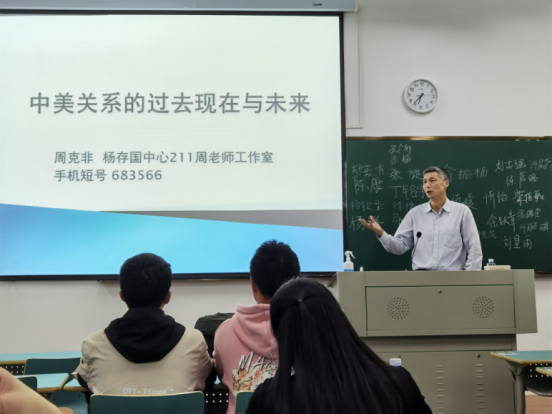 活动中,周克非老师分析了自1945年抗战胜利以来中美关系的三个阶段,列举了经济总量、军费开支、研发经费等多个方面数据,对中美两个国家的实力进行了对比,并重点分析了“国际竞争归根结底是什么?”。周老师指出,中国国防力量加强后,美国不敢轻易对中国进行威慑,我们中华民族有的是同敌人血战到底的气概,能在自力更生基础上复兴的决心,并拥有跻身于世界之林的能力。热切激昂的话语使同学们深受鼓舞。