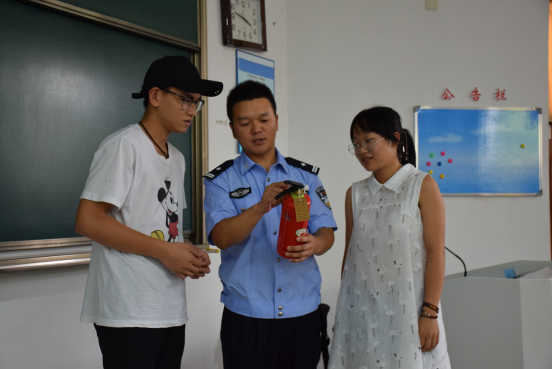 讲座围绕“防范电信诈骗常识”“防火防电安全常识”“防抢防盗安全常识”三个重点展开,同时为了让同学们能够更好的了解防火防盗知识,王政委还带来了车内灭火器、背包、胸包充当道具,分别邀请同学上台示范,向同学们展示了使用灭火器需要注意的地方,以及如何背包最为安全。最后,王政委引用习近平总书记的话:“幸福都是奋斗出来的”,勉励同学们不忘学业,将蓝图变为现实,将学习进行到底。