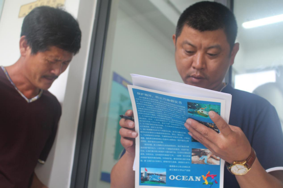 接着,队员们与渔政执法船员进行了交流,并向他们提出了疑惑寻求不同意见。由于渔政船主要属于公务船,在垃圾处理方面做得比一般渔船好。渔政船船员说先不说政府的监管力度是否够,船员的素质提高才是首要问题。之后,队员们向远洋渔船的船员发放了宣传单和问卷并询问了关于渔船上的垃圾处理问题。从收回的问卷和活动现场的谈话情况看部分船员有一定的环保意识,但由于船上空间小,作业时间长等问题,垃圾只能入海。他们表示可以随着船上设备的补充,逐渐减小入海垃圾量。