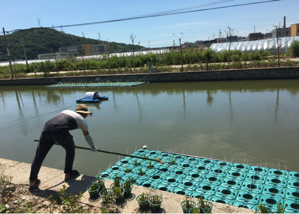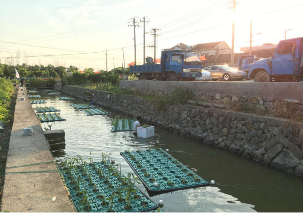 本着为环境做贡献,守护最美舟山水环境的初心,队长徐嘉俊同学带领该团队借此次三下乡暑期活动来到岱山。7月18日,舟山电视台随行专访一天,清晨五点团队成员集合出发去工地,清一色的遮阳帽,袖套是他们的标配装备。五点半左右团队到达工地正式开始工作,团队成员分工明确,有的在修剪植物,有的将修剪好的植物种植到镂空花盆中,有的同学负责搬运,一盆盆栽种好的植物被运送到投放人员手中,投放的同学将植物准确固定在浮床上,工作有条不紊的进行着。到9点左右,太阳已经很大了,天气十分炎热,团队成员们个个汗流浃背,一些人的衣服早已被汗水浸湿,不停地擦汗,遮阳帽似乎并没有带来多大的作用。尽管条件艰难,同学们依旧坚韧工作着,期间记者朋友们就团队每天的工作安排,工作进度,成员工作情况,个人感想等问题对各成员进行了采访。截至18号该团队先已经在岱山工作19天了,已经完成标准河道(全长1000米)134套生态浮岛、6万多株植物的种植,目前正在石马岙社区蟹钳岙河道(全长500米)进行第二河道的河道治理。舟山电视台采访团跟拍一天,实地采访“吾水吾治”团队利用生态浮岛治理水环境的全过程,记录下的不仅有项目团队的工作成绩,更有yl9193永利集团大学生治水的精神,不怕苦不怕累坚持到底。