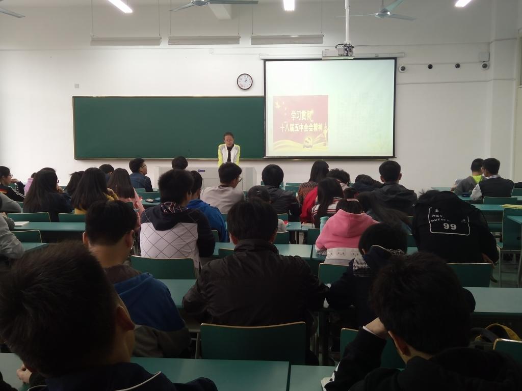 为积极学习落实关于十八届五中全会的会议内容、精神要求,努力将学习宣传全会精神落实到学生道德建设上去,同学们被分为10个学习小组,分别针对十八届五中全会的十个关键词:全面小康、经济速度、创新发展、绿色发展、协调发展、开放发展、共享发展、二孩政策、将强党建、反腐斗争,进行学习讨论。讨论会前,每个小组针对自己小组的关键词深入学习其中相关内容,深刻理解党在此方面提出的要求内容建设,并交流各自想法观点,最后将小组学习成果用PPT的形式进行分享展现。在讨论会上,十个小组依次上台和大家分享本小组的学习心得体会,让全班对十八届五中全会有更为全面的了解。最后,讨论会在掌声中顺利结束。
