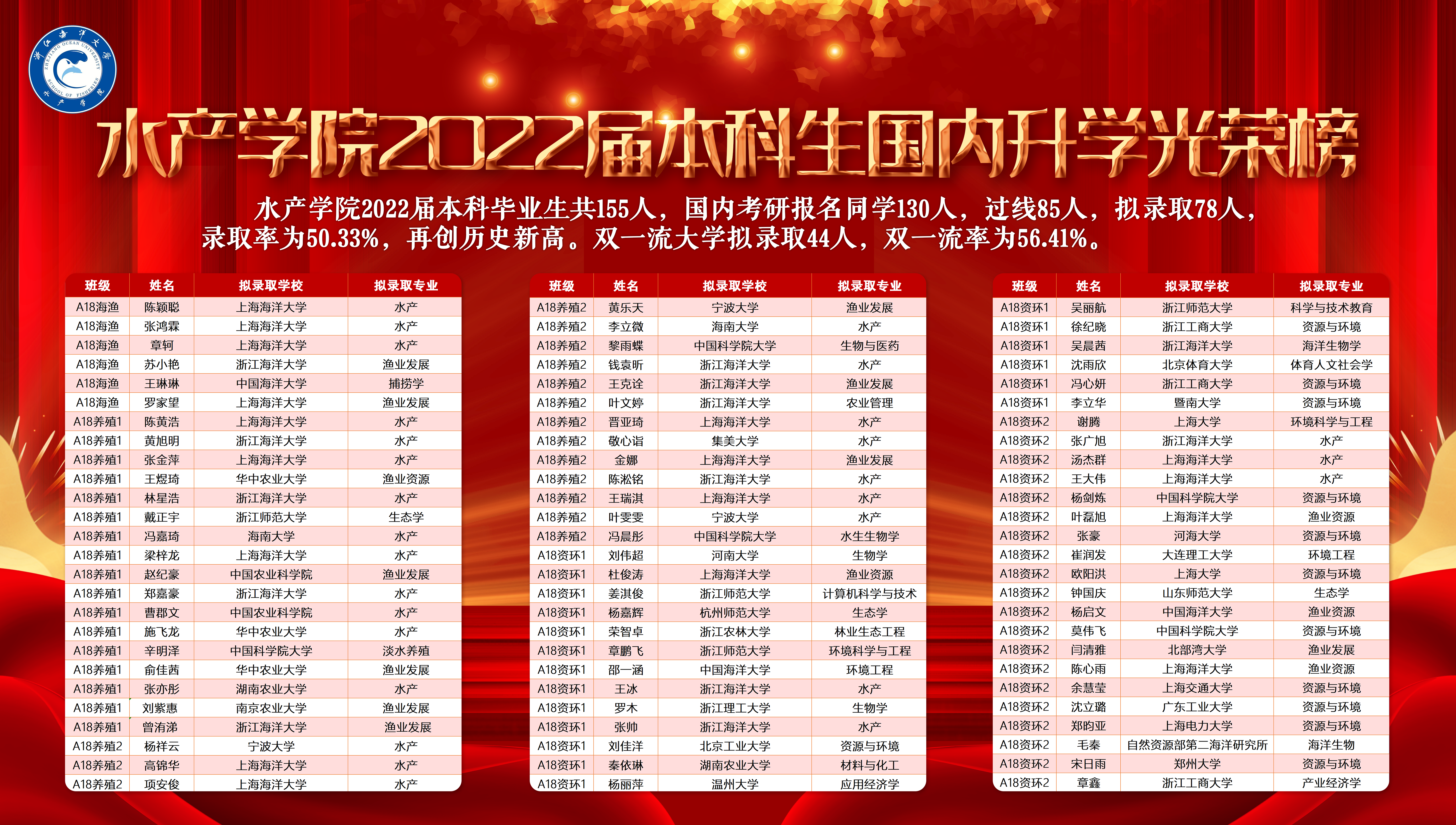 蟾宫折桂处,金榜题名时。yl9193永利集团2022届考研学子捷报频传。国内考研报名130人,过线85人,截至目前拟录取78人,录取率为50.33%,再创历史新高。双一流大学拟录取44人,双一流率为56.41%。另有1人已申请到日本东京海洋大学研究生,5人正在申请俄罗斯南乌拉尔大学研究生。这些成绩的取得,既是考研学子寒窗苦读、不懈奋斗的结果,也是学院不断提高教学质量、注重学科建设,坚持三全育人的体现。