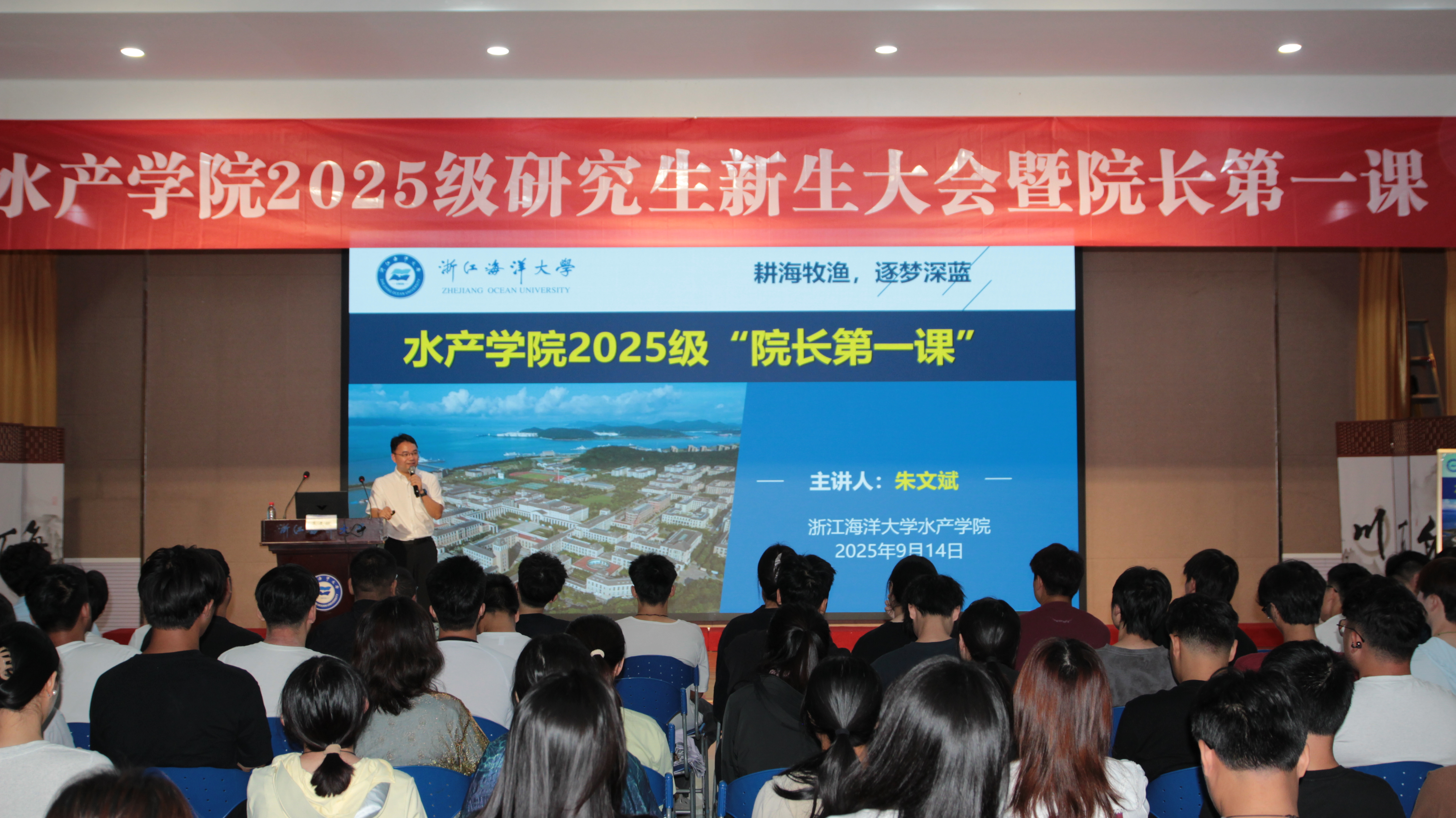 朱文斌副院长以《耕海牧渔,逐梦深蓝》为题,围绕学院学科优势、科研成果与海洋渔业新质生产力发展展开分享。他详细介绍学院在海洋渔业、水产养殖、渔业资源保护等领域的科研平台与团队实力,希望研究生主动对接国家战略需求,在研究生阶段深耕专业、勇于创新,为海洋强国建设与水产行业高质量发展贡献青春力量。